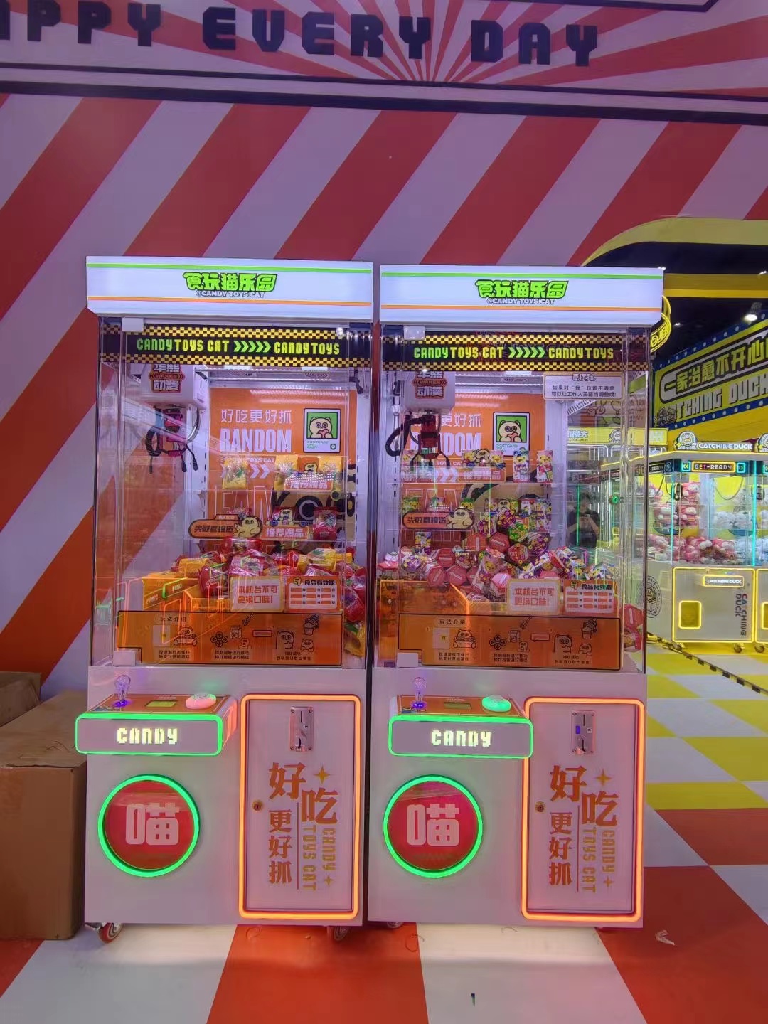 Especially for the Candy Toys Cat giant crane machine ,we have prepared some big bags full of snacks to catch ,it brought many people around it and wait to play.